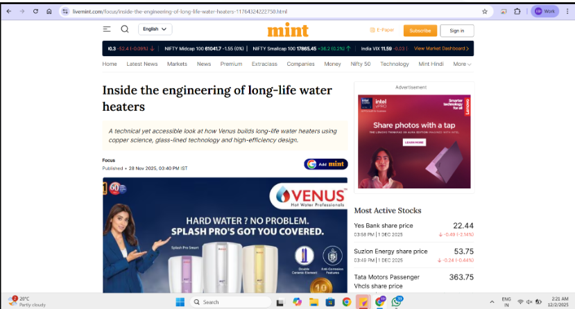 Venus Home Appliances (P) Ltd. is one of India’s leading manufacturers of water heaters with over six decades of industry presence. The company has expanded into fans, OTG, solar water heaters, heatpump water heaters, solar power solutions, room heaters, air coolers and irons. Its products are recognized for quality, reliability and performance, with a strong focus on customer service and long term trust.